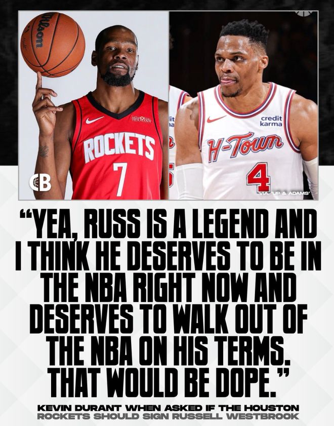 KD的言论至少能证明,他在互联网上听到一些消息说威少可能加盟火箭,他自己也愿意再度跟威少联手,而且杜兰特认为威少应该由自己来决定是否留在NBA打球或离开NBA,不该是这个联盟主动抛弃威少。